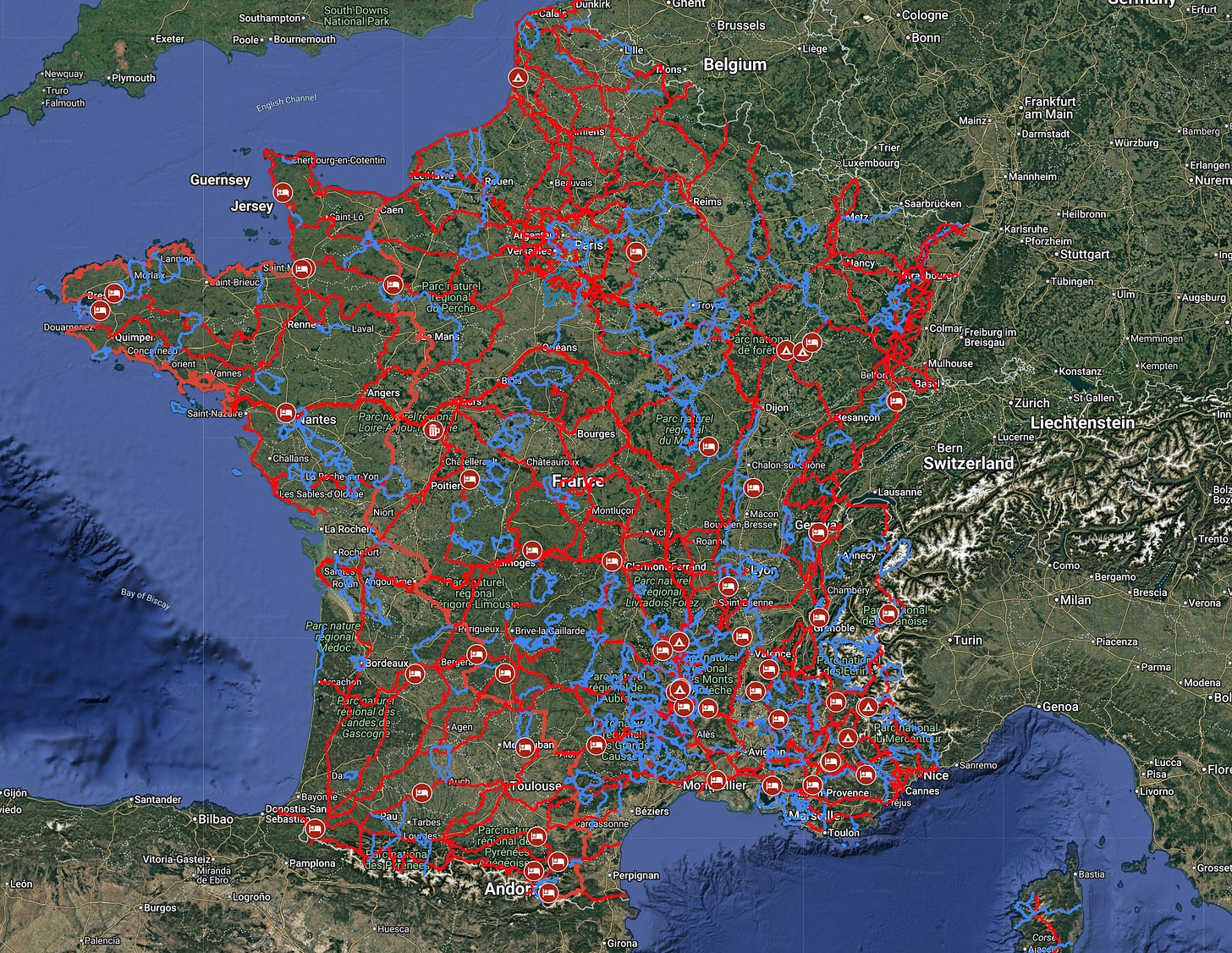 This fun map of the Grandes Randonnées, the French national hiking path system. I have NO idea how the numbering system works.