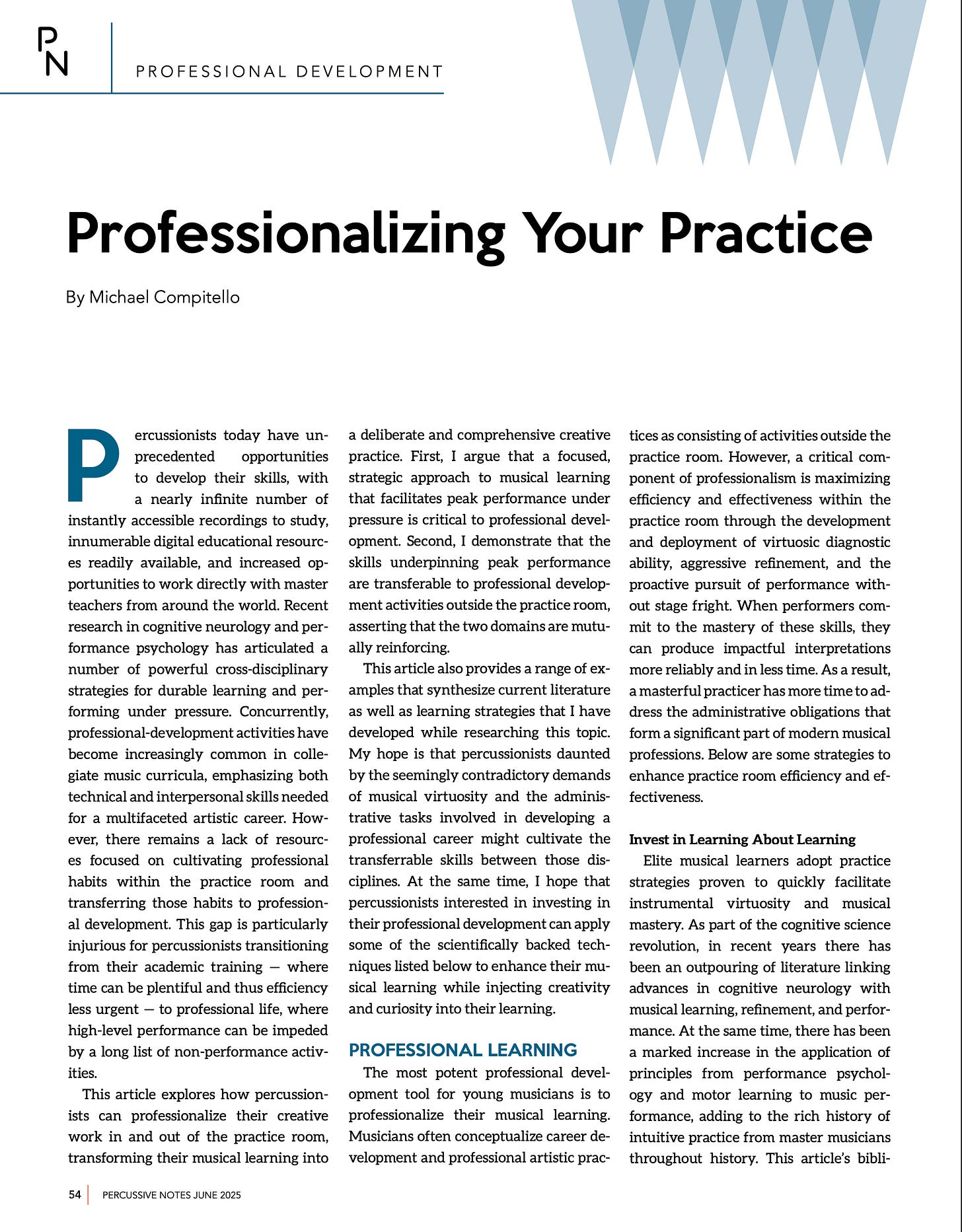 What if we devoted some time to understanding why and how our learning works? So, in the spirit of learning about why something works, I wanted to share a recent article I penned for Percussive Notes, the journal/magazine of the Percussive Arts Society. Tasked with writing something for their Professional Development section, I decided to write about the utility of professionalizing ones musical learning, of creating a deliberate and comprehensive creative practice around musical learning.